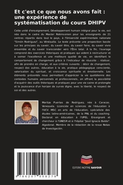 Cette unité d'enseignement, Développement humain intégral pour la vie, est née dans le cadre du Master Robinsonien pour les enseignants de 21 centres répartis dans tout le pays, à l'Université expérimentale nationale "Simón Rodríguez", au Vénézuéla. Le texte présente une proposition basée sur les principes du savoir, du savoir être, du savoir faire, du savoir vivre ensemble et du savoir transcender vers l'Être total. À la fin, l'ouvrage comprend des exercices théoriques et pratiques qui aident à restructurer et à semer l'excellence et une meilleure qualité de vie, en identifiant le comportement de changement grâce à l'indicateur de réussite : réaliser, afin de prendre en charge, et aux critères suivants : désir de changement, respect des autres, éducation à la vie, pratique pédagogique consciente, valorisation du spirituel, et croissance spirituelle et émotionnelle. Les éléments présentés nous permettent d'apprécier la vie quotidienne des contextes humains personnels et professionnels, en offrant la possibilité d'acquérir des outils théoriques et pratiques pour une vie saine et prolongée et la jouissance d'un horizon de survie digne, avec la liberté, le respect de soi et des autres.