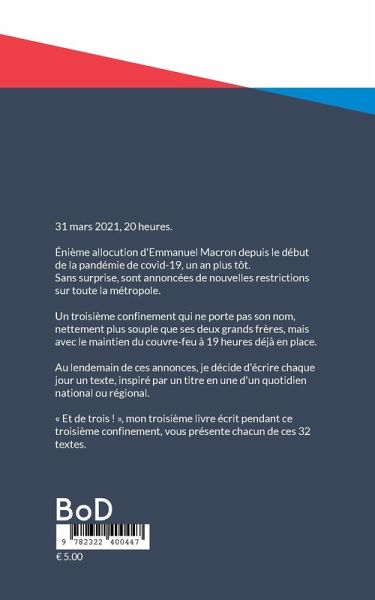 31 mars 2021, 20 heures.Énième allocution d'Emmanuel Macron depuis le débutde la pandémie de Covid-19, un an plus tôt.Sans surprise, sont annoncées de nouvelles restrictionssur toute la métropole.Un troisième confinement qui ne porte pas son nom,nettement plus souple que ses deux grands frères, maisavec le maintien du couvre-feu à 19 heures déjà en place.Au lendemain de ces annonces, je décide d'écrire chaquejour un texte, inspiré par un titre en une d'un quotidiennational ou régional.« Et de trois ! », mon troisième livre écrit pendant cetroisième confinement, vous présente chacun de ces 32textes.