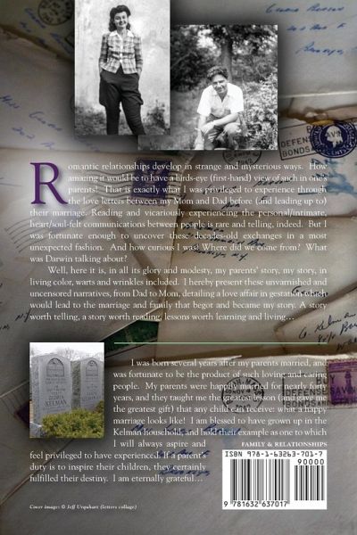 Romantic relationships develop in strange and mysterious ways. How amazing it would be to have a birds-eye (first-hand) view of such in one’s parents! That is exactly what I was privileged to experience through the love letters between my Mom and Dad before (and leading up to) their marriage. Reading and vicariously experiencing the personal/intimate, heart/soul-felt communications between people is rare and telling, indeed. But I was fortunate enough to uncover these decades-old exchanges in a most unexpected fashion. And how curious I was! Where did we come from? What was Darwin talking about? Well, here it is, in all its glory and modesty, my parents’ story in living color, warts and wrinkles included. I hereby present these unvarnished and uncensored narratives, from Dad to Mom, detailing a love affair in gestation which would lead to the marriage and family that became my story. A story worth telling, a story worth reading, lessons worth learning and living...