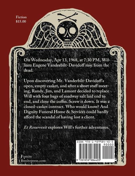"On Wednesday, Apr 13, 1968, at 7:30 PM, William Eugene Vanderbilt-Davidoff rose from the dead. Upon discovering Mr. Vanderbilt-Davidoff's open, empty casket, and after a short staff meeting, Randy, Jim, and Lamont decided to replace Will with four bags of roadway salt laid end to end, and close the coffin. Screw it down. It was a closed-casket contract. Who would know? And Dignity Funeral Home & Services could hardly afford the scandal of having lost a client. Et Resurrexit explores Will's further adventures"--