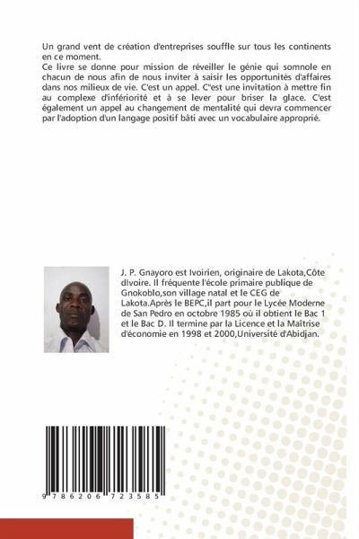 Un grand vent de création d'entreprises souffle sur tous les continents en ce moment. Ce livre se donne pour mission de réveiller le génie qui somnole en chacun de nous afin de nous inviter à saisir les opportunités d'affaires dans nos milieux de vie. C'est un appel. C''est une invitation à mettre fin au complexe d'infériorité et à se lever pour briser la glace. C'est également un appel au changement de mentalité qui devra commencer par l'adoption d'un langage positif bâti avec un vocabulaire approprié.