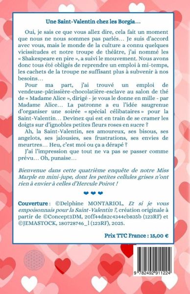 Une Saint-Valentin chez les Borgia... Oui, je sais ce que vous allez dire, cela fait un moment que nous ne nous sommes pas parlés... Je suis d'accord avec vous, mais le monde de la culture a connu quelques vicissitudes et notre troupe de théâtre, j'ai nommé les Shakespeare en pire, a suivi le mouvement. Nous avons donc tous été obligés de reprendre un emploi à mi-temps, les cachets de la troupe ne suffisant plus à subvenir à nos besoins... Pour ma part, j'ai trouvé un emploi de vendeuse-pâtissière-chocolatière-esclave au salon de thé de Madame Alice, dirigé - je vous le donne en mille - par Madame Alice... La patronne a eu l'idée saugrenue d'organiser une soirée spécial célibataires pour la Saint-Valentin... Devinez qui est en train de se cramer les doigts sur d'ignobles petites fleurs roses en sucre ? Ah, la Saint-Valentin, ses amoureux, ses bisous, ses angelots, ses jalousies, ses frustrations, ses envies de meurtres... Heu, c'est moi ou ça a dérapé ? J'ai l'impression que tout ne va pas se passer comme prévu... Oh, punaise... Bienvenue dans cette quatrième enquête de notre Miss Marple en mini-jupe, dont les petites cellules grises n'ont rien à envier à celles d'Hercule Poirot !