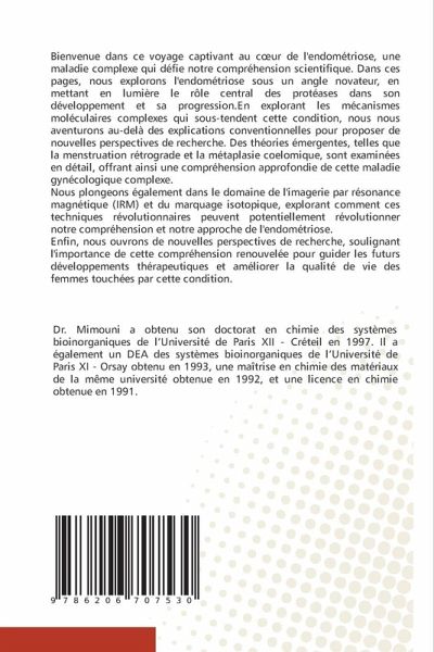 Bienvenue dans ce voyage captivant au coeur de l'endométriose, une maladie complexe qui défie notre compréhension scientifique. Dans ces pages, nous explorons l'endométriose sous un angle novateur, en mettant en lumière le rôle central des protéases dans son développement et sa progression.En explorant les mécanismes moléculaires complexes qui sous-tendent cette condition, nous nous aventurons au-delà des explications conventionnelles pour proposer de nouvelles perspectives de recherche. Des théories émergentes, telles que la menstruation rétrograde et la métaplasie coelomique, sont examinées en détail, offrant ainsi une compréhension approfondie de cette maladie gynécologique complexe.Nous plongeons également dans le domaine de l'imagerie par résonance magnétique (IRM) et du marquage isotopique, explorant comment ces techniques révolutionnaires peuvent potentiellement révolutionner notre compréhension et notre approche de l'endométriose.Enfin, nous ouvrons de nouvelles perspectives de recherche, soulignant l'importance de cette compréhension renouvelée pour guider les futurs développements thérapeutiques et améliorer la qualité de vie des femmes touchées par cette condition.