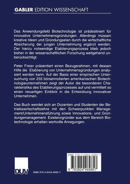 Peter Freier präsentiert einen Bezugsrahmen, mit dessen Hilfe die Etablierung von Unternehmensgründungen analysiert werden kann. Auf der Basis einer empirischen Untersuchung von 255 börsennotierten amerikanischen Biotechnologieunternehmen zeigt der Autor die besonderen Charakteristika des Etablierungsprozesses auf und vermittelt so einen neuartigen Einblick in die Entwicklung innovativer Unternehmen.