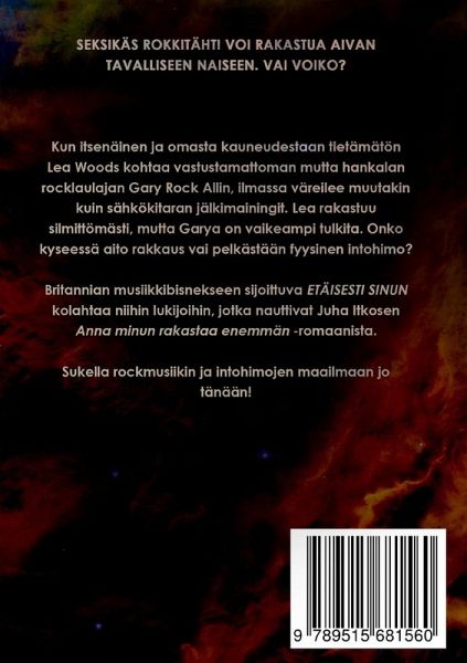 Seksikäs rokkitähti voi rakastua aivan tavalliseen naiseen. Vai voiko? Kun itsenäinen ja omasta kauneudestaan tietämätön Lea Woods kohtaa vastustamattoman mutta hankalan rocklaulajan Gary Rock Allin, ilmassa väreilee muutakin kuin sähkökitaran jälkimainingit. Lea rakastuu silmittömästi, mutta Garya on vaikeampi tulkita. Onko kyseessä aito rakkaus vai pelkästään fyysinen intohimo? Britannian musiikkibisnekseen sijoittuva ETÄISESTI SINUN kolahtaa niihin lukijoihin, jotka nauttivat Juha Itkosen Anna minun rakastaa enemmän -romaanista. Sukella rockmusiikin ja intohimojen maailmaan ja nappaa oma kappaleesi jo tänään!