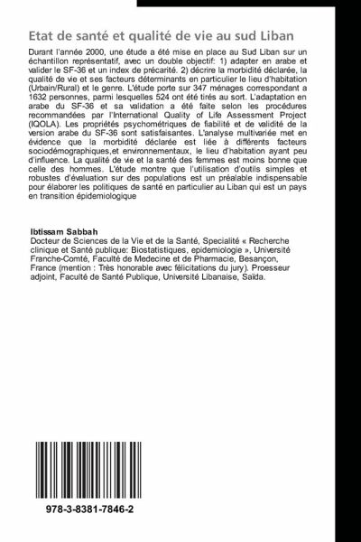 Durant l année 2000, une étude a été mise en place au Sud Liban sur un échantillon représentatif, avec un double objectif: 1) adapter en arabe et valider le SF-36 et un index de précarité. 2) décrire la morbidité déclarée, la qualité de vie et ses facteurs déterminants en particulier le lieu d habitation (Urbain/Rural) et le genre. L'étude porte sur 347 ménages correspondant a 1632 personnes, parmi lesquelles 524 ont été tirés au sort. L adaptation en arabe du SF-36 et sa validation a été faite selon les procédures recommandées par l International Quality of Life Assessment Project (IQOLA). Les propriétés psychométriques de fiabilité et de validité de la version arabe du SF-36 sont satisfaisantes. L'analyse multivariée met en évidence que la morbidité déclarée est liée à différents facteurs sociodémographiques,et environnementaux, le lieu d habitation ayant peu d influence. La qualité de vie et la santé des femmes est moins bonne que celle des hommes. L'étude montre que l utilisation d outils simples et robustes d évaluation sur des populations est un préalable indispensable pour élaborer les politiques de santé en particulier au Liban qui est un pays en transition épidemiologique