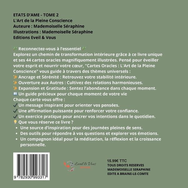 Une approche personnalisée : Adaptez chaque tirage à vos besoins et à vos questionnements du moment. Des illustrations artistiques uniques qui capturent l'essence de chaque thème pour une immersion totale. Un outil d'équilibre : Redécouvrez la sérénité, développez votre gratitude et renforcez vos relations grâce à des rituels simples et efficaces.