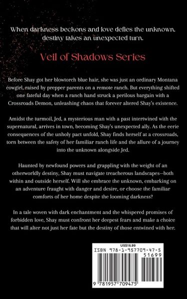 When darkness beckons and love defies the unknown, destiny takes an unexpected turn. Before Shay got her blowtorch blue hair, she was just an ordinary Montana cowgirl, raised by prepper parents on a remote ranch. But everything shifted one fateful day when a ranch hand struck a perilous bargain with a Crossroads Demon, unleashing chaos that forever altered Shay's existence. Amidst the turmoil, Jed, a mysterious man with a past intertwined with the supernatural, arrives in town, becoming Shay's unexpected ally. As the eerie consequences of the unholy pact unfold, Shay finds herself at a crossroads, torn between the safety of her familiar ranch life and the allure of a journey into the unknown alongside Jed. Haunted by newfound powers and grappling with the weight of an otherworldly destiny, Shay must navigate treacherous landscapes-both within and outside herself. Will she embrace the unknown, embarking on an adventure fraught with danger and desire, or choose the familiar comforts of her home despite the looming darkness? In a tale woven with dark enchantment and the whispered promises of forbidden love, Shay must confront her deepest fears and make a choice that will alter not just her fate but the destiny of those entwined with her. *If you're new to Veil of Shadows, feel free to start here*
