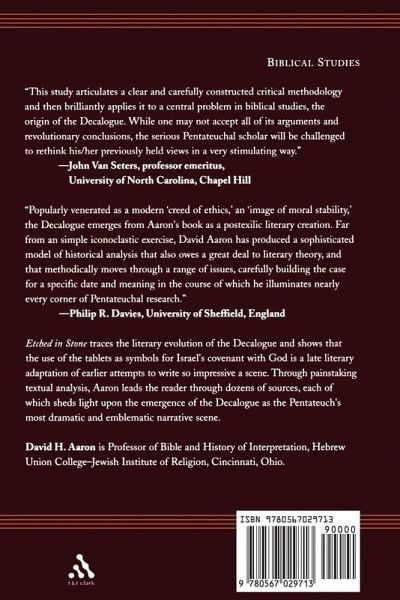 The document known as The Ten Commandments, more formally referred to as The Decalogue, remains among the most controversial and complicated passages in the Hebrew Bible. Even today, the twentieth chapter of Exodus continues to serve as a major religious and ethical icon within popular culture and religious communities, despite its many unexplained elements. Lawsuits over the display of Decalogue Tablets have occupied courtrooms in more than half the states of this country. And yet, few people understand that there is not one, but three versions of what are usually called “The Ten Commandments.” Moreover, when their ideological underpinnings are examined closely, these versions prove to be quite antithetical to one another. Even fewer are aware of the probability that these documents were written very late in the history of biblical literature-indeed, so late as to constitute a literary afterthought in the development of Israelite ethnic self-definition. In Etched in Stone: The Emergence of the Decalogue Tradition, Aaron examines the question of when the Decalogue versions were written and why. The main focus of this book is the literary phenomenon known as “the tablets” and how it functioned within the broader narrative. Aaron argues not only that the inclusion of the Decalogue texts was quite late in the development of the Pentateuch’s canon, but that their integration preserves vestiges of highly charged ideological conflicts that were inadvertently neutralized by the rather bland and generic ethical precepts coined among its verses. Etched in Stone provides a paradigm for merging a variety of critical methods (source criticism, tradition criticism, ideological criticism, redaction criticism) and literary approaches that have heretofore been under-explored. In this sense, Etched in Stone will be read by scholars for its far-reaching conclusions and used by students (undergraduates, seminary, graduate) for learning approaches to the sequencing of biblical materials.
