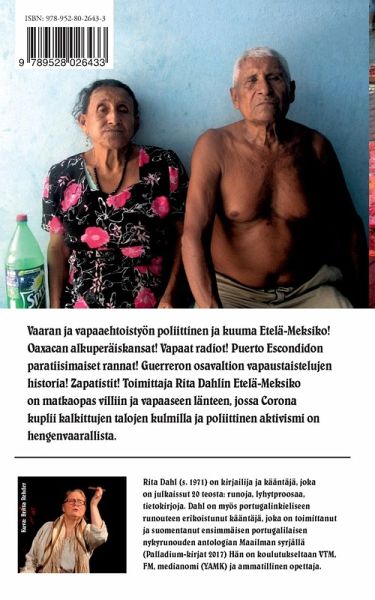 Vaaran ja vapaaehtoistyön poliittinen ja kuuma Etelä-Meksiko! Oaxacan alkuperäiskansat! Vapaat radiot! Puerto Escondidon paratiisimaiset rannat! Guerreron osavaltion vapaustaistelujen historia! Zapatistit! Toimittaja Rita Dahlin Etelä-Meksiko on matkaopas villiin ja vapaaseen länteen, jossa Corona kuplii kalkittujen talojen kulmilla ja poliittinen aktivismi on hengenvaarallista.