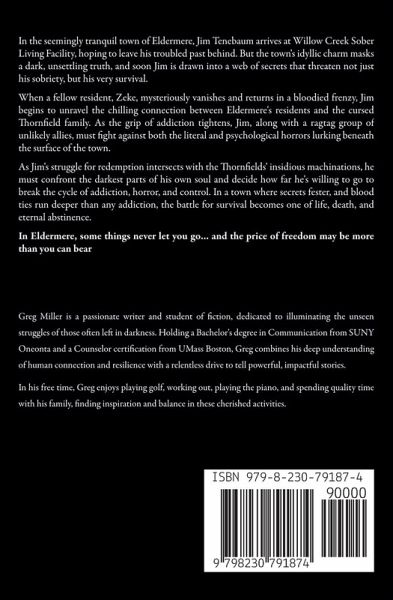 In the seemingly tranquil town of Eldermere, Jim Tenebaum arrives at Willow Creek Sober Living Facility, hoping to leave his troubled past behind. But the town's idyllic charm masks a dark, unsettling truth, and soon Jim is drawn into a web of secrets that threaten not just his sobriety, but his very survival. When a fellow resident, Zeke, mysteriously vanishes and returns in a bloodied frenzy, Jim begins to unravel the chilling connection between Eldermere's residents and the cursed Thornfield family. As the grip of addiction tightens, Jim, along with a ragtag group of unlikely allies, must fight against both the literal and psychological horrors lurking beneath the surface of the town. As Jim's struggle for redemption intersects with the Thornfields' insidious machinations, he must confront the darkest parts of his own soul and decide how far he's willing to go to break the cycle of addiction, horror, and control. In a town where secrets fester, and blood ties run deeper than any addiction, the battle for survival becomes one of life, death, and eternal abstinence. In Eldermere, some things never let you go... and the price of freedom may be more than you can bear