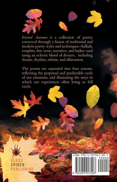 Eternal Autumn is a collection of poetry conveyed through a fusion of traditional and modern poetry styles and techniques-ballads, couplets, free verse, narrative, and haiku-and using an eclectic blend of devices, including rhyme, rhythm, refrain, and alliteration. The poems are separated into four seasons, reflecting the perpetual and predictable cycle of our emotions, and illustrating the ways in which our experiences often bring us full circle.