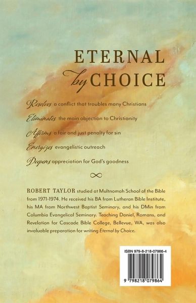 Robert Taylor studied at Multnomah School of the Bible from 1971-1974. He received his BA from Lutheran Bible Institute, his MA from Northwest Baptist Seminary, and his DMin from Columbia Evangelical Seminary. Teaching Daniel, Romans, and Revelation for Cascade Bible College, Bellevue, WA, was also invaluable preparation for writing Eternal by Choice.