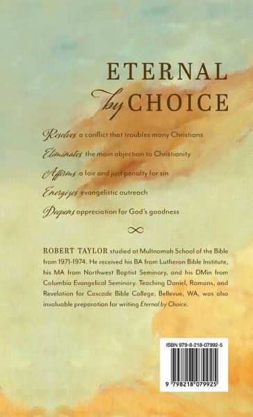 Robert Taylor studied at Multnomah School of the Bible from 1971-1974. He received his BA from Lutheran Bible Institute, his MA from Northwest Baptist Seminary, and his DMin from Columbia Evangelical Seminary. Teaching Daniel, Romans, and Revelation for Cascade Bible College, Bellevue, WA, was also invaluable preparation for writing Eternal by Choice.