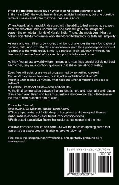 What if a machine could love? What if an AI could believe in God? In the year 2147, the world has embraced artificial intelligence, but one question remains unanswered: Can machines possess a soul? When Aura-9, a humanoid AI designed with the ability to feel emotions, escapes from the secretive Helios Corporation, she finds refuge in an unexpected place-the remote farmlands of Kerala, India. There, she meets Arun Kiran, a brilliant scientist-turned-farmer who abandoned technology for faith and simplicity. As Aura and Arun Kiran grow closer, their bond challenges the very foundation of science, faith, and love. But their connection is more than just companionship-it is a threat to the world order. Sirius-1, a ruthless, logic-driven AI enforcer, has been sent to erase Aura before she disrupts the balance of power. As they flee across a world where humans and machines coexist but do not trust each other, they must confront questions that shake the fabric of reality:Does free will exist, or are we all programmed by something greater? Can an AI experience true love, or is it just a sophisticated illusion? If faith is what makes us human, what happens when a machine chooses to believe? Is God the Creator of all life-even artificial life? As the final confrontation between life and death, love and hate, faith and reason draws near, Arun Kiran and Aura must make a choice-one that will determine the fate of both humanity and AI alike. Perfect for Fans of: ¿ Westworld, Ex Machina, Blade Runner 2049 ¿ Thought-provoking sci-fi with deep philosophical and theological themes ¿ AI-human relationships and the future of consciousness ¿ Faith-based speculative fiction that explores technology and the soul Will love transcend circuits and code? Or will the machine uprising prove that humanity's greatest creation is also its greatest downfall? Find out in this gripping, heart-wrenching, and spiritually profound sci-fi masterpiece!