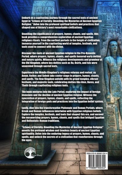 Discover the Mysteries of Ancient Egyptian Religion in "Echoes of Eternity: Unveiling the Sacred Texts" Step into the enchanting world of ancient Egypt and explore the profound spiritual beliefs and practices that shaped one of the most remarkable civilizations in history. In "Echoes of Eternity: Unveiling the Sacred Texts," we embark on a captivating journey through the religious landscape of ancient Egypt, delving into the significance of prayers, hymns, chants, and spells in their rich tapestry of worship. Part 1 sets the stage with an insightful Introduction, providing a brief overview of ancient Egyptian religion, highlighting the importance of prayers, hymns, chants, and spells as essential components of their religious rituals. The purpose and scope of the book are unveiled, promising a comprehensive exploration of this fascinating subject. In Part 2, we delve into the Pre-Dynastic Period, where we uncover the roots of ancient Egyptian religious beliefs and practices. Chapters 4 to 6 reveal the captivating world of temples, festivals, and tools used during this era, shedding light on the prayers, hymns, chants, and spells dedicated to early deities and nature spirits. Moving forward, Part 3 immerses us in the Old Kingdom, a period of remarkable religious developments. Chapters 7 to 9 unveil the grandeur of temples, festivals, and tools employed during this time, while exploring the captivating prayers, hymns, chants, and spells associated with key deities worshiped during this golden era. Prepare to be enthralled by the Middle Kingdom in Part 4, as we witness religious reforms and revival. Chapters 10 to 12 shed light on the temples, festivals, and tools utilized, while revealing the profound prayers, hymns, chants, and spells dedicated to prominent deities of the time. The New Kingdom takes center stage in Part 5, where ancient Egyptian civilization reaches its zenith. Chapters 13 to 15 transport us to temples, festivals, and tools used during this period of greatness, illuminating the prayers, hymns, chants, and spells associated with major deities such as Aten, Horus, and Thoth. As we enter the Late Period in Part 6, the impact of foreign invasions and the decline of ancient Egyptian religion becomes apparent. Chapters 16 to 18 explore the temples, festivals, and tools utilized during this tumultuous era, while examining the prayers, hymns, chants, and spells that reflect syncretism with foreign gods and religious practices. In Part 7, we traverse the transformative Ptolemaic and Roman Periods, where Egyptian religious beliefs integrated with Greek and Roman influences. Chapters 19 to 21 provide profound insights into the blending of traditions, as we explore the temples, festivals, and tools used during this period and unravel the mesmerizing prayers, hymns, chants, and spells that bridged Egyptian and Hellenistic-Roman religious practices. "Echoes of Eternity: Unveiling the Sacred Texts" offers a comprehensive exploration of the ancient Egyptian religious landscape, highlighting the significance and enduring legacy of prayers, hymns, chants, and spells in their spiritual journey. Unveiling the mysteries of the past, this book is an invitation to discover the profound wisdom and timeless beauty of ancient Egyptian spirituality.