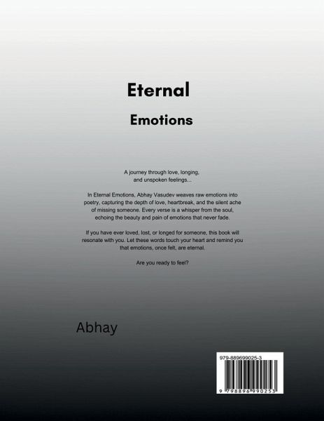 emotions that cannot be described but are trying to be expressed by emotions. Eternal Emotions is a deeply heartfelt poetry collection that captures love, longing, and loss in its rawest form. Each verse reflects intense emotions-unspoken confessions, aching nostalgia, and the bittersweet echoes of the past. Abhay weaves words that resonate with those who have loved deeply and lost profoundly, making this book a companion for lonely nights and quiet reflections. If you've ever felt the weight of unexpressed emotions or the lingering presence of someone no longer near, these poems will speak to your soul, offering solace in shared sorrow and beauty in the pain of love.