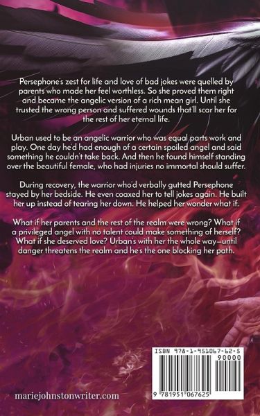 Persephone's zest for life and love of bad jokes were quelled by parents who made her feel worthless. So she proved them right and became the angelic version of a rich mean girl. Until she trusted the wrong person and suffered wounds that'll scar her for the rest of her eternal life. Urban used to be an angelic warrior who was equal parts work and play. One day he'd had enough of a certain spoiled angel and said something he couldn't take back. And then he found himself standing over the beautiful female, who had injuries no immortal should suffer. During recovery, the warrior who'd verbally gutted Persephone stayed by her bedside. He even coaxed her to tell jokes again. He built her up instead of tearing her down. He helped her wonder what if. What if her parents and the rest of the realm were wrong? What if a privileged angel with no talent could make something of herself? What if she deserved love? Urban's with her the whole way-until danger threatens the realm and he's the one blocking her path.