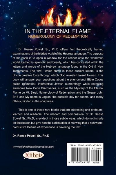 Dr. Reese Powell Sr., Ph.D offers first theoretically framed examinations of the hidden world of the Hebrew language. The purpose of his book is to open a window for the reader onto the wondrous world, bathed in splendor and beauty, which lies concealed within the letters and words of the Hebrew language found in the Old & New Testaments. The "fire", which burns in these ancient letters, is the Divine creative force through which God reveals Himself to man. This book will answer your questions about the phenomenal Bible Codes called (gematria), interpretive Jewish numerology, while revealing awesome New Code Discoveries, such as the Mystery of the Eternal Flame on Mt. Sinai, Numerology of Redemption, and the Gospel John 3:16 and My name is Legion, the possible day for dooms, and many others, hidden in the scriptures. This is one of those rare books that are interesting and profound, learned and readable. The wisdom and compassion, of Dr. Reese Powell Sr., Ph.D, is evident in those subtle ways, which do not intrude on the reader, but give him the satisfaction of knowing that a rich warm, productive lifetime of experience is flavoring the text. Dr. Reese Powell Sr., Ph.D