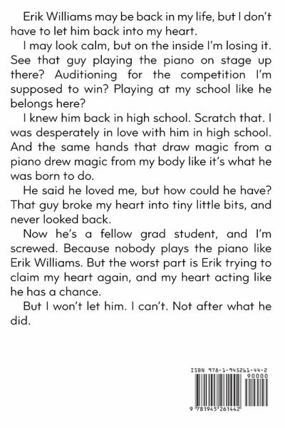 Erik Williams may be back in my life, but I don’t have to let him back into my heart. I may look calm, but on the inside I’m losing it. See that guy playing the piano on stage up there? Auditioning for the competition I’m supposed to win? Playing at my school like he belongs here? I knew him back in high school. Scratch that. I was desperately in love with him in high school. And the same hands that draw magic from a piano drew magic from my body like it’s what he was born to do. He said he loved me, but how could he have? That guy broke my heart into tiny little bits, and never looked back. Now he’s a fellow grad student, and I’m screwed. Because nobody plays the piano like Erik Williams. But the worst part is Erik trying to claim my heart again, and my heart acting like he has a chance. But I won’t let him. I can’t. Not after what he did.