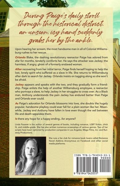 During Paige's daily stroll through the historical district, an unseen, icy hand suddenly grabs her by the ankle. Upon hearing her scream, the most handsome man in all of Colonial Williamsburg rushes to her rescue. Orlando Blake, the dashing revolutionary reenactor Paige has adored from afar for months, tenderly comforts her. He says the attacker was Jackey; the harmless, if angry, ghost of a formerly enslaved woman. After recovering from her initial terror, Paige finds herself hoping to help the lost, lonely spirit who suffered as a slave in life. She returns to Williamsburg after dark to search for Jackey. Orlando insists on tagging along so she won't be afraid. Jackey appears and speaks with the two, and they gradually form a friendship. Paige enlists the help of another Williamsburg employee, a reenactor who portrays a slave, to help Jackey in her struggles to cross over. As a Black man, Anthony understands the pain Jackey has endured better than Paige and Orlando ever could. As Paige's adoration for Orlando blossoms into love, she doubts the hugely popular, handsome playboy could ever fall for a plain woman like her. Meanwhile, Jackey and Anthony have fallen in love even though the veil between life and death separates them. Is there any hope for a happy ending...for anyone?