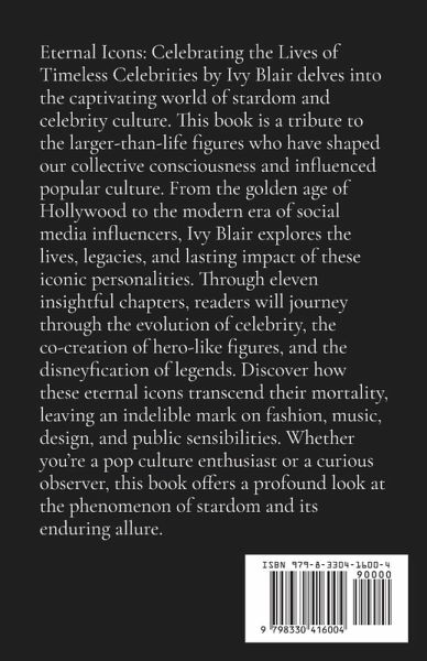 Eternal Icons: Celebrating the Lives of Timeless Celebrities by Ivy Blair delves into the captivating world of stardom and celebrity culture. This book is a tribute to the larger-than-life figures who have shaped our collective consciousness and influenced popular culture. From the golden age of Hollywood to the modern era of social media influencers, Ivy Blair explores the lives, legacies, and lasting impact of these iconic personalities. Through eleven insightful chapters, readers will journey through the evolution of celebrity, the co-creation of hero-like figures, and the disneyfication of legends. Discover how these eternal icons transcend their mortality, leaving an indelible mark on fashion, music, design, and public sensibilities. Whether you're a pop culture enthusiast or a curious observer, this book offers a profound look at the phenomenon of stardom and its enduring allure.