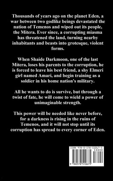 Thousands of years ago on the planet Eden, a war between two godlike beings devastated the nation of Temenos and wiped out its people, the Mitera. Ever since, a corrupting miasma has threatened the land, turning nearby inhabitants and beasts into grotesque, violent forms. When Shaide Darkmoon, one of the last Mitera, loses his parents to the corruption, he is forced to leave his best friend, the shy elven girl Amari, and begin training as a soldier in the human army. All he wants to do is survive, but through a twist of fate, he will come to wield a power of unimaginable strength. This power will be needed like never before, for a darkness is rising in the ruins of Temenos, and it will not stop until its corruption has spread to every corner of Eden.