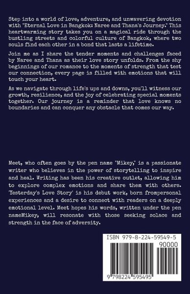 Step into a world of love, adventure, and unwavering devotion with "Eternal Love in Bangkok: Naree and Thana's Journey." This heartwarming story takes you on a magical ride through the bustling streets and colorful culture of Bangkok, where two souls find each other in a bond that lasts a lifetime. Join me as I share the tender moments and challenges faced by Naree and Thana as their love story unfolds. From the shy beginnings of our romance to the moments of strength that test our connection, every page is filled with emotions that will touch your heart. As we navigate through life's ups and downs, you'll witness our growth, resilience, and the joy of celebrating special moments together. Our journey is a reminder that love knows no boundaries and can conquer any obstacle that comes our way. Through simple words and heartfelt emotions, "Eternal Love in Bangkok" invites you to believe in the power of love and the beauty of finding your soulmate. Whether you're a dreamer or simply looking for a story that warms your heart, this book promises to be a delightful companion on your reading journey.