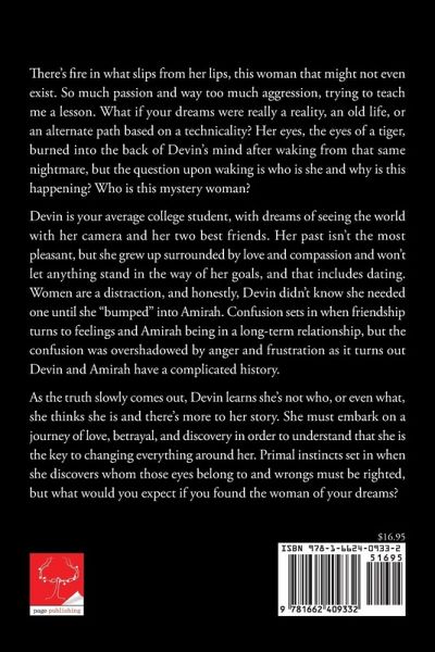 There's fire in what slips from her lips, this woman that might not even exist. So much passion and way too much aggression, trying to teach me a lesson. What if your dreams were really a reality, an old life, or an alternate path based on a technicality? Her eyes, the eyes of a tiger, burned into the back of Devin's mind after waking from that same nightmare, but the question upon waking is who is she and why is this happening? Who is this mystery woman? Devin is your average college student, with dreams of seeing the world with her camera and her two best friends. Her past isn't the most pleasant, but she grew up surrounded by love and compassion and won't let anything stand in the way of her goals, and that includes dating. Women are a distraction, and honestly, Devin didn't know she needed one until she "bumped" into Amirah. Confusion sets in when friendship turns to feelings and Amirah being in a long-term relationship, but the confusion was overshadowed by anger and frustration as it turns out Devin and Amirah have a complicated history. As the truth slowly comes out, Devin learns she's not who, or even what, she thinks she is and there's more to her story. She must embark on a journey of love, betrayal, and discovery in order to understand that she is the key to changing everything around her. Primal instincts set in when she discovers whom those eyes belong to and wrongs must be righted, but what would you expect if you found the woman of your dreams?
