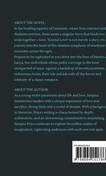 In the vast world of billions of people, two individuals find themselves drawn together by fate. As they explore their connection, they uncover secrets that could alter everything. With each revelation, they must confront their fears and desires, navigating a journey filled with twists and turns. Therefore, esteemed reader, I invite you to embark on this unforgettable journey, to immerse yourself in the pages of "Eternal Love," and discover a realm where passion knows no bounds and love knows no end. May you find comfort in the enchanting odyssey of Martin and Sanya, and may you emerge with a revitalized sense of hope and wonder. Yet, as destiny weaves its intricate tapestry, casting shadows over their path, Martin and Sanya confront the ultimate trial of their love. When fate threatens to tear them asunder, will they defy the odds and carve a new path together? Or will they succumb to the forces intent on tearing them apart, their love fading into the annals of time? Only time will reveal the answer as they teeter on the edge of fate, their hearts intertwined in an eternal dance of love. Therefore, cherished reader, I leave you with this inquiry: can love truly conquer all? As you accompany Martin and Sanya on their voyage, contemplate the depths of their devotion and the potency of their love. And perchance, within the pages of "Eternal Love," you may discover the resolution you seek.