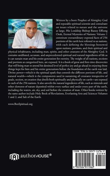 Written by a born Prophet of Almighty God and reputable spiritual scientist and consultant on issues related to nature and the universe at large, His Lordship Bishop Bassey Effiong Orok, Eternal Mysteries of Nations: Volume 1 constitute extraordinary exposed facts of 256 portions of the earth here referred to as nations, with each defining the blessings bestowed upon nations, portions, and their spiritual and physical inhabitants, including man, spirits, and other creatures of the Almighty God. It contains undiluted, accurate, and unprecedented spiritual and natural ingredients of life as it can sustain man and his entire generation for eternity. The weight of all nations, sections and portions as categorized here, are exposed. It is a book of great and first-time discoveries that will bring man to attend his destined level of perfect joy and go ahead in enjoying those things kept for him and his entire generations before the foundation of the earth was laid. Divine power?which is the spiritual spark that controls the different portions of life, and natural wealth?which is the components used in sustaining all creatures irrespective of grade, section, or creation that dwells both spiritually and physically on earth?are exposed in each of the 256 nations. It also unveils the natural ingredients of life, such as minerals and other elements of nature deposited within every surface and under every part of the earth, including the waters, air, sky, and soil before the creation of man. Other books written by the same author include Holy Book of Revelations, Everlasting Arts and Sciences Volumes 1 and 2, and Salt of the Earth. www.BeoSpiritual.org