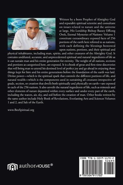 Written by a born Prophet of Almighty God and reputable spiritual scientist and consultant on issues related to nature and the universe at large, His Lordship Bishop Bassey Effiong Orok, Eternal Mysteries of Nations: Volume 1 constitute extraordinary exposed facts of 256 portions of the earth here referred to as nations, with each defining the blessings bestowed upon nations, portions, and their spiritual and physical inhabitants, including man, spirits, and other creatures of the Almighty God. It contains undiluted, accurate, and unprecedented spiritual and natural ingredients of life as it can sustain man and his entire generation for eternity. The weight of all nations, sections and portions as categorized here, are exposed. It is a book of great and first-time discoveries that will bring man to attend his destined level of perfect joy and go ahead in enjoying those things kept for him and his entire generations before the foundation of the earth was laid. Divine power-which is the spiritual spark that controls the different portions of life, and natural wealth-which is the components used in sustaining all creatures irrespective of grade, section, or creation that dwells both spiritually and physically on earth-are exposed in each of the 256 nations. It also unveils the natural ingredients of life, such as minerals and other elements of nature deposited within every surface and under every part of the earth, including the waters, air, sky, and soil before the creation of man. Other books written by the same author include Holy Book of Revelations, Everlasting Arts and Sciences Volumes 1 and 2, and Salt of the Earth. www.BeoSpiritual.org