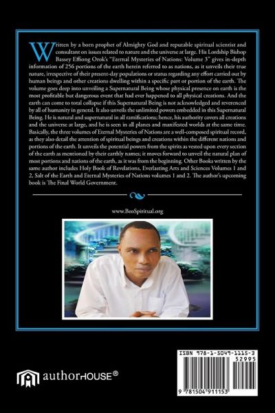 Written by a born prophet of almighty god and reputable spiritual scientist and consultant on issues related to nature and the universe at large, His Lordship Bishop Bassey Effiong Orok's "Eternal Mysteries of Nations: Volume 3" gives in-depth information of 256 portions of the earth herein referred to as nations, as it unveils their true nature, irrespective of their present-day populations or status regarding any effort carried out by human beings and other creations dwelling within a specific part or portion of the earth. The volume goes deep into unveiling a Supernatural Being whose physical presence on earth is the most profitable but dangerous event that had ever happened to all physical creations. And the earth can come to total collapse if this Supernatural Being is not acknowledged and reverenced by all of humanity in general. It also unveils the unlimited powers embedded in this Supernatural Being. He is natural and supernatural in all ramifications; hence, his authority covers all creations and the universe at large, and he is seen in all planes and manifested worlds at the same time. Basically, the three volumes of Eternal Mysteries of Nations are a well-composed spiritual record, as they also detail the attention of spiritual beings and creations within the different nations and portions of the earth. It unveils the potential powers from the spirits as vested upon every section of the earth as mentioned by their earthly names; it moves forward to unveil the natural plan of most portions and nations of the earth, as it was from the beginning. Other Books written by the same author includes Holy Book of Revelations, Everlasting Arts and Sciences Volumes 1 and 2, Salt of the Earth and Eternal Mysteries of Nations volumes 1 and 2. The author's upcoming book is The Final World Government. www.BeoSpiritual.org