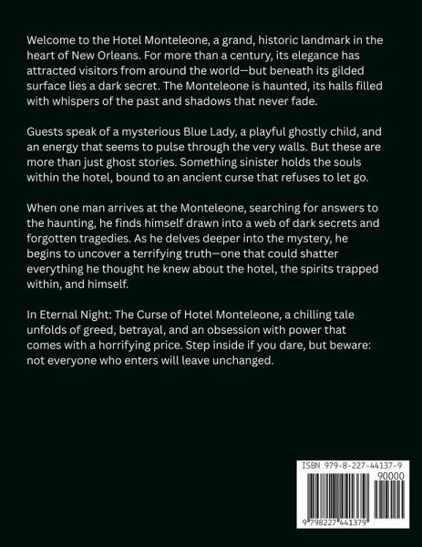Welcome to the Hotel Monteleone, a grand, historic landmark in the heart of New Orleans. For more than a century, its elegance has attracted visitors from around the world-but beneath its gilded surface lies a dark secret. The Monteleone is haunted, its halls filled with whispers of the past and shadows that never fade. Guests speak of a mysterious Blue Lady, a playful ghostly child, and an energy that seems to pulse through the very walls. But these are more than just ghost stories. Something sinister holds the souls within the hotel, bound to an ancient curse that refuses to let go. When one man arrives at the Monteleone, searching for answers to the haunting, he finds himself drawn into a web of dark secrets and forgotten tragedies. As he delves deeper into the mystery, he begins to uncover a terrifying truth-one that could shatter everything he thought he knew about the hotel, the spirits trapped within, and himself. In Eternal Night: The Curse of Hotel Monteleone, a chilling tale unfolds of greed, betrayal, and an obsession with power that comes with a horrifying price. Step inside if you dare, but beware: not everyone who enters will leave unchanged.