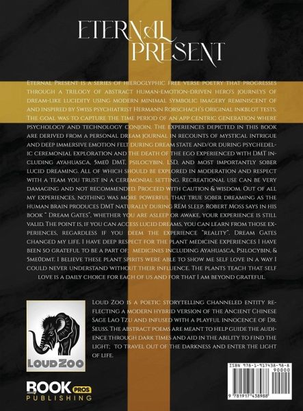 Eternal Present is a series of hieroglyphic free verse poetry that progresses through a trilogy of abstract human-emotion-driven hero's journeys of dream-like lucidity using modern minimal symbolic imagery reminiscent of and inspired by Swiss psychiatrist Hermann Rorschach's original inkblot tests. The goal was to capture the time period of an app-centric generation where psychology and technology conjoin. The experiences depicted in this book are derived from a personal dream journal in recounts of mystical intrigue and deep immersive emotion felt during dream state and/or during psychedelic ceremonial exploration and the death of the ego experienced with DMT including ayahuasca, 5-MeO-DMT, psilocybin, LSD, and most importantly sober lucid dreaming. All of which should be explored in moderation and respect with a team you trust in a ceremonial setting. Recreational use can be very damaging and not recommended. Proceed with caution and wisdom. Out of all my experiences, nothing was more powerful than true sober dreaming as the human brain produces DMT naturally during REM sleep. Robert Moss says in his book "Dream Gates," whether you are asleep or awake, your experience is still valid. The point is, if you can access lucid dreams, you can learn from those experiences, regardless if you deem the experience "reality." Dream Gates changed my life. I have deep respect for the plant medicine experiences I have been so grateful to be a part of, including ayahuasca, psilocybin, and 5-MeO-DMT. I believe these plant spirits were able to show me self-love in a way I could never understand without their influence. The plants teach that self-love is a daily choice for each of us and for that, I am beyond grateful.