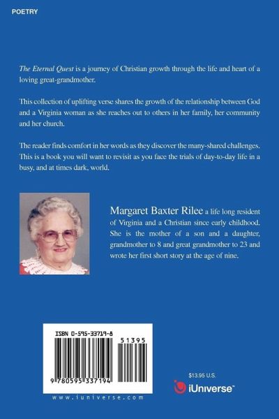 The Eternal Quest is a journey of Christian growth through the life and heart of a loving great-grandmother. This collection of uplifting verse shares the growth of the relationship between God and a Virginia woman as she reaches out to others in her family, her community and her church. The reader finds comfort in her words as they discover the many-shared challenges. This is a book you will want to revisit as you face the trials of day-to-day life in a busy, and at times dark, world.