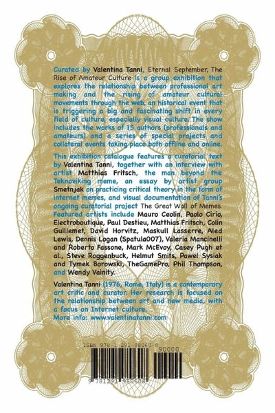 Eternal September. The Rise of Amateur Culture is a group exhibition that explores the relationship between professional art making and the rising of amateur cultural movements through the web, an historical event that is triggering a big and fascinating shift in every field of culture, especially visual culture. This catalogue features a curatorial text by Valentina Tanni, together with an interview with artist Matthias Fritsch, the man beyond the Teknoviking meme, an essay by artist group Smetnjak on practicing critical theory in the form of internet memes, and visual documentation of Tanni's ongoing curatorial project The Great Wall of Memes. Featured artists: Mauro Ceolin, Paolo Cirio, Electroboutique, Paul Destieu, Matthias Fritsch, Colin Guillemet, David Horvitz, Maskull Lasserre, Aled Lewis, Dennis Logan (Spatula007), Valeria Mancinelli and Roberto Fassone, Mark McEvoy, Casey Pugh, Steve Roggenbuck, Helmut Smits, Pawe¿ Sysiak & Tymek Borowski, TheGamePro, Phil Thompson, Wendy Vainity.