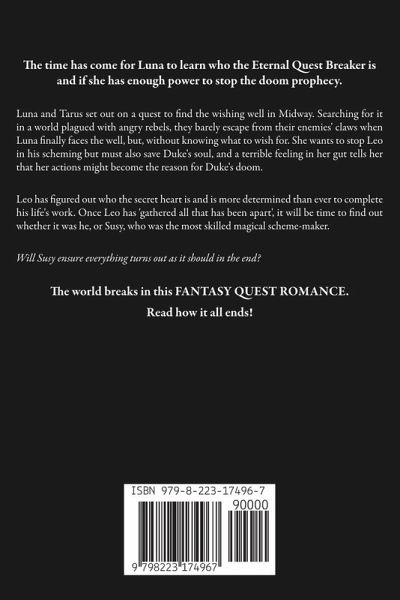 The time has come for Luna to learn who the Eternal Quest Breaker is and if she has enough power to stop the doom prophecy. Luna and Tarus set out on a quest to find the wishing well in Midway. Searching for it in a world plagued with angry rebels, they barely escape from their enemies' claws when Luna finally faces the well, but, without knowing what to wish for. She wants to stop Leo in his scheming but must also save Duke's soul, and a terrible feeling in her gut tells her that her actions might become the reason for Duke's doom. Leo has figured out who the secret heart is and is more determined than ever to complete his life's work. Once Leo has 'gathered all that has been apart', it will be time to find out whether it was he, or Susy, who was the most skilled magical scheme-maker. Will Susy ensure everything turns out as it should in the end? The world breaks in this FANTASY QUEST ROMANCE. Read how it all ends!