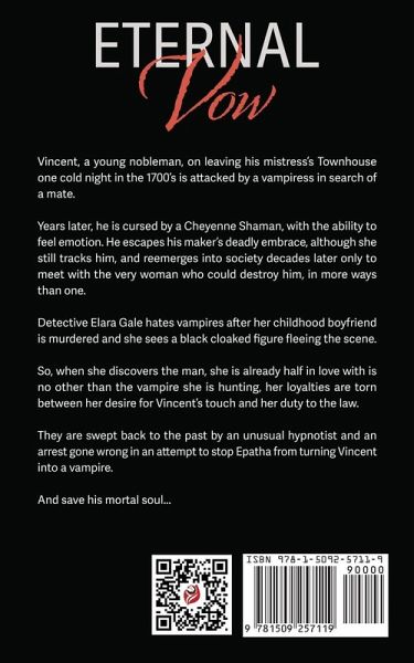Vincent, a young nobleman, on leaving his mistress's Townhouse one cold night in the 1700's is attacked by a vampiress in search of a mate. Years later, he is cursed by a Cheyenne Shaman, with the ability to feel emotion. He escapes his maker's deadly embrace, although she still tracks him, and reemerges into society decades later only to meet with the very woman who could destroy him, in more ways than one. Detective Elara Gale hates vampires after her childhood boyfriend is murdered and she sees a black cloaked figure fleeing the scene. So, when she discovers the man, she is already half in love with is no other than the vampire she is hunting, her loyalties are torn between her desire for Vincent's touch and her duty to the law. They are swept back to the past by an unusual hypnotist and an arrest gone wrong in an attempt to stop Epatha from turning Vincent into a vampire. And save his mortal soul...