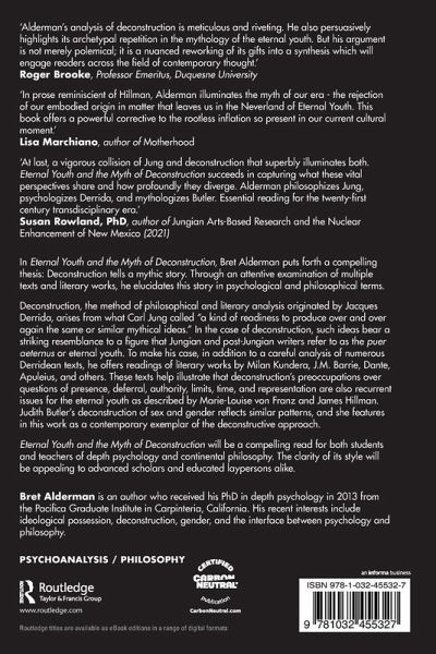 Deconstruction, the method of philosophical and literary analysis originated by Jacques Derrida, arises from what Carl Jung called "a kind of readiness to produce over and over again the same or similar mythical ideas." In the case of deconstruction, such ideas bear a striking resemblance to a figure that Jungian and Post-Jungian writers refer to as the puer aeternus or eternal youth. To make his case, in addition to a careful analysis of numerous Derridean texts, he offers readings of literary works by Milan Kundera, J.M. Barrie, Dante, Apuleius, and others. These texts help illustrate that deconstruction's preoccupations over questions of presence, deferral, authority, limits, time, and representation are also recurrent issues for the eternal youth as described by Marie-Louise Von Franz and James Hillman. Judith Butler's deconstruction of sex and gender reflects similar patterns, and she features in this work as a contemporary exemplar of the deconstructive approach.