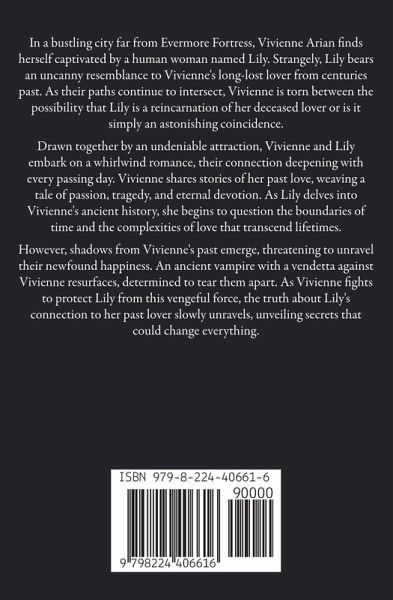 In a bustling city far from Evermore Fortress, Vivienne Arian finds herself captivated by a human woman named Lily. Strangely, Lily bears an uncanny resemblance to Vivienne's long-lost lover from centuries past. As their paths continue to intersect, Vivienne is torn between the possibility that Lily is a reincarnation of her deceased lover or is it simply an astonishing coincidence. Drawn together by an undeniable attraction, Vivienne and Lily embark on a whirlwind romance, their connection deepening with every passing day. Vivienne shares stories of her past love, weaving a tale of passion, tragedy, and eternal devotion. As Lily delves into Vivienne's ancient history, she begins to question the boundaries of time and the complexities of love that transcend lifetimes. However, shadows from Vivienne's past emerge, threatening to unravel their newfound happiness. An ancient vampire with a vendetta against Vivienne resurfaces, determined to tear them apart. As Vivienne fights to protect Lily from this vengeful force, the truth about Lily's connection to her past lover slowly unravels, unveiling secrets that could change everything.