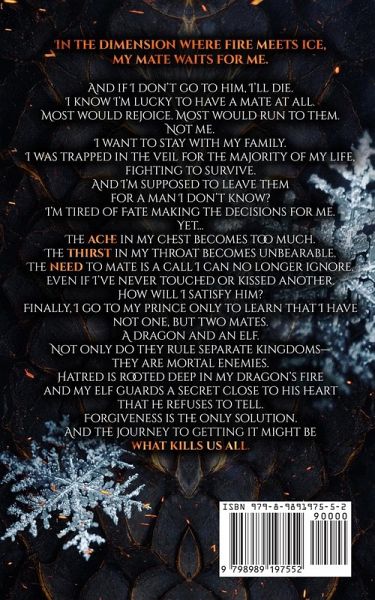 In the dimension where fire meets ice, my mate waits for me. And if I don't go to him, I'll die. I know I'm lucky to have a mate at all. Most would rejoice. Most would run to them. Not me. I want to stay with my family. I was trapped in the veil for the majority of my life, fighting to survive. And I'm supposed to leave them for a man I don't know? I'm tired of Fate making the decisions for me. Yet... The ache in my chest becomes too much. The thirst in my throat becomes unbearable. The need to mate is a call I can no longer ignore. Even if I've never touched or kissed another. How will I satisfy him? Finally, I go to my prince only to learn that I have not one, but two mates. A dragon and an elf. Not only do they rule separate kingdoms-they are mortal enemies. Hatred is rooted deep in my dragon's fire and my elf guards a secret close to his heart that he refuses to tell. Forgiveness is the only solution. And the journey to getting it might be what kills us all.