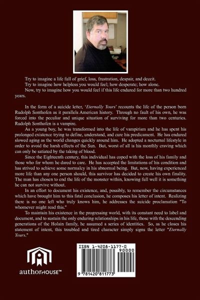 After more than two centuries, the man felt he had endured enough. Born Rudolph Sonthofen and transformed into a vampire at a young age, he adapted to the limitations of his bizarre being. But, his prolonged life was filled with loss, grief, frustration, and deceit. No longer did this cursed person feel it worthwhile to survive. No longer did he want to pass the endless nights hopeless and alone. No longer did he want to be immortal among mortals. Having outlived all who knew him, this vampire recounts his life in a suicide letter which he signs anonymously "Eternally Yours."