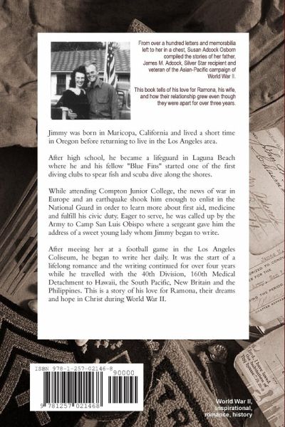 From over a hundred letters and memorabilia left to her in a chest, Susan Adcock Osborn compiled the stories of her father, James M. Adcock, Silver Star recipient and veteran of the Asian-Pacific campaign of World War II. An Army Staff Sergeant asks Jimmy to write Ramona and the two pen pals finally meet at the Los Angeles Coliseum after a football game. Jimmy and Ramona marry before he is sent overseas to Hawaii, New Britain and the Philippines. This book tells about Susan's discovery in the things left behind and a Christian hope for the future found in two young lovers during WWII.