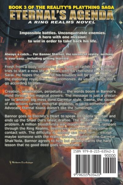 Always a catch... For Bannor Starfist, the savant of reality, nothing is ever easy...including getting married. Fresh from an earth-shattering duel with allfather Odin, Bannor tries to start a new life in Malan with his cherished betrothed, Sarai. He hopes the worst of his troubles will be preparing for the elaborate royal marriage ceremonies. As usual, things don't go according to plan... Creation, annihilation, perpetuity... the words boom in Bannor's mind through his magical powers. The message is just a precursor to another big mess done Garmtur style. Daena, the savant of attractions turned immortal goddess, is up to something and Advocate Eternal Koass doesn't like the rumblings. Bannor goes to Eternity's Heart to speak on Daena's behalf and ends up the Shael Dal's latest draftee. The Protectorate has a problem. A million bloodthirsty war-mages are running rampant through the Ring Realms, destroying everything they come in contact with. The difficulty is, nobody can find them... except maybe someone with the reality-bending power of the Garmtur Shak'Nola. Bannor agrees to help but quickly learns the hard lesson that no good deed goes unpunished...