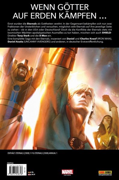 WENN GÖTTER AUF ERDEN KÄMPFEN ...Einst wurden die Eternals als Gottheiten verehrt. In der Gegenwart bekämpfen sich nun zwei Fraktionen der Unsterblichen und versuchen, möglichst viele Eternals auf ihre jeweilige Seite zu ziehen - ob in den USA oder Deutschland! Doch da die Konflikte der Eternals stets mit kosmischen Mächten apokalyptischen Ausmaßes zu tun haben, mischen sich auch SHIELDDirektor Tony Stark und die X-Men ein.Eine komplette Saga mit den Eternals, inszeniert von Daniel und Charles Knauf (IRON MAN), Daniel Acuña (UNCANNY AVENGERS) und anderen, in deutscher Erstveröffentlichung.ENTHÄLT: ETERNALS (2008) 1-9 & ETERNALS (2008) ANNUAL 1