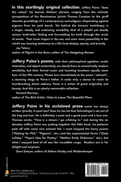 Jeffery Paine's poems, with their philosophical agitation, erotic intensities, and abject melancholy, are clearly from an eccentrically modern sensibility, but their formal music and haunting locutions equally seem born of the l9th century. Please turn immediately to the poem "Jahrzeit", a stunning elegy to Paine's father. It waits only a stanza to reach its heartbreaking direct address.