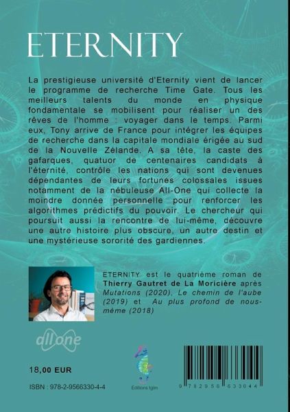 La prestigieuse université d'Eternity vient de lancer le programme de recherche Time Gate. Les meilleurs talents du monde en physique fondamentale se mobilisent pour réaliser un des rêves de l'homme : voyager dans le temps. Parmi eux, Tony arrive de France pour intégrer les équipes scientifiques dans la capitale mondiale érigée au sud de la Nouvelle Zélande. À sa tête, la caste des gafarques, quatuor de centenaires candidats à l'éternité, contrôle les nations qui sont devenues dépendantes de leurs fortunes colossales issues notamment de la nébuleuse All-One qui collecte la moindre donnée personnelle pour renforcer les algorithmes prédictifs du pouvoir. Le chercheur découvre derrière la quête du voyage temporel une autre histoire plus obscure, un autre destin et d'une mystérieuse sororité des gardiennes.