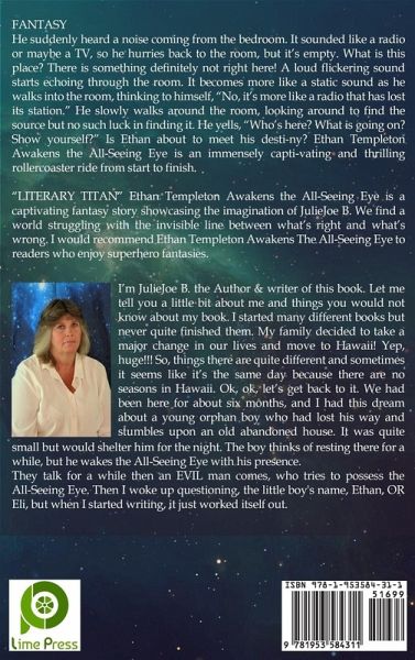 I'm JulieJoe B. the Author & writer of this book. Let me tell you a little bit about me and things you would not know about my book. I started many different books but never quite finished them. My family decided to take a major change in our lives and move to Hawaii! Yep, huge!!! So, things there are quite different and sometimes it seems like it's the same day because there are no seasons in Hawaii. Ok, ok, let's get back to it. We had been here for about six months, and I had this dream about a young orphan boy who had lost his way and stumbles upon an old abandoned house. It was quite small but would shelter him for the night. The boy thinks of resting there for a while, but he wakes the All-Seeing Eye with his presence. They talk for a while then an EVIL man comes, who tries to possess the All-Seeing Eye. Then I woke up questioning, the little boy's name, Ethan, OR Eli, but when I started writing, it just worked itself out.