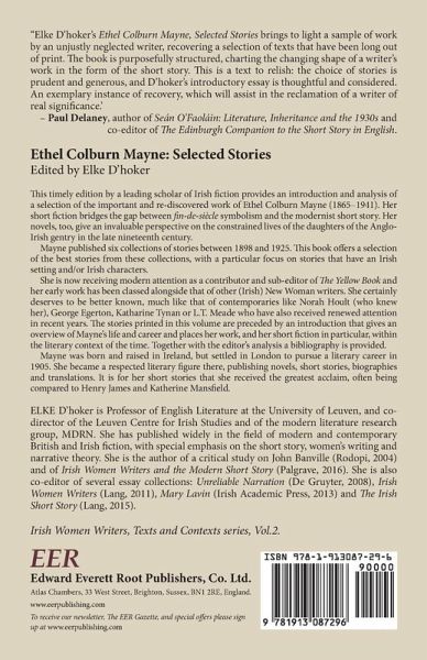 Ethel Colburn Mayne (1865-1941) is a now largely forgotten Anglo-Irish writer who was born and raised in Ireland, but settled in London to pursue a literary career in 1905. She became a respected literary figure there, publishing novels, short stories, biographies and translations. It is for her short stories that she received the greatest acclaim, often being compared to Henry James and Katherine Mansfield. Mayne published six collections of stories between 1898 and 1925. This book offers a selection of the best stories from these collections, with a particular focus on stories that have an Irish setting and/or Irish characters. The stories printed in this volume are preceded by an introduction that gives an overview of Mayne's life and career and places her work, and her short fiction in particular, within the literary context of the time. Mayne's first story came out in The Yellow Book under the pen-name of Frances E. Huntly in 1895. She then published novels: Jessie Vandeleur (1902), The Fourth Ship (1908), Gold Lace: A Study of Girlhood (1913), One of Our Grandmothers (1916), and her collections of stories, including Things That No One Tells (1910). Mayne's work is out of print and has been for a long time. She has received some attention recently as a contributor and sub-editor of The Yellow Book and her early work has been classed alongside that of other (Irish) New Woman writers. Yet, the rest of her work is interesting and significant as well: her short fiction bridges the gap between fin-de-siècle symbolism and the modernist short story, while her novels and some or her short stories give an invaluable perspective on the constrained lives of the daughters of the Anglo-Irish gentry in the late nineteenth century. Her work certainly deserves to be better known, much like that of contemporaries like Norah Hoult (who knew her), George Egerton, Katharine Tynan or L.T. Meade who have also received renewed attention in recent years. A bibliography is also provided.